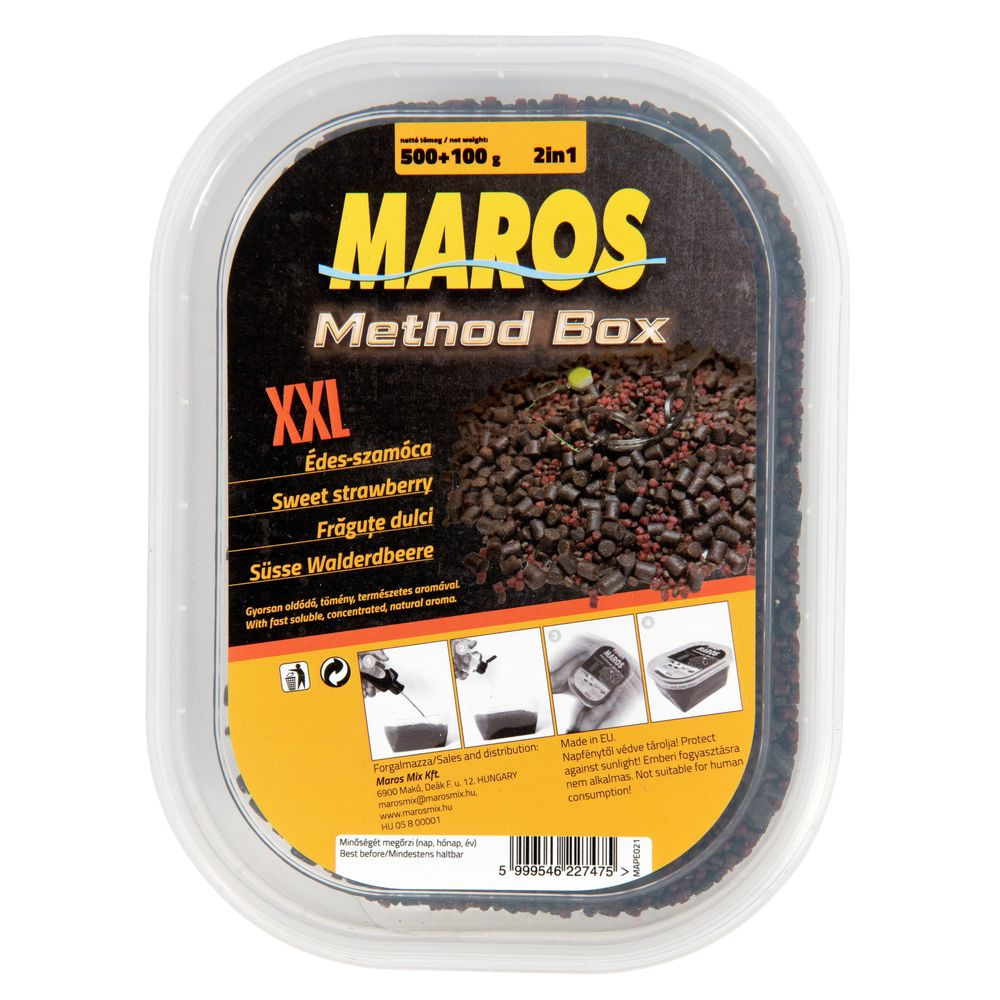 A prémium minőségű halibut pelletnek és rendkívül tömény aromának köszönhetően az egyik legfogósabb pontyos etetőanyagnak számít a Method Box. Évek óta bizonyítja fogósságát olyan körülmények között is, amikor a legtöbb etetőanyag és csali kudarcot vallott. 500+100 grammos kiszerelésben kapható. Minden Method Box tartalmaz egy deciliter Maros Mix Extra Aktivátort, ami nem más, mint egy ízletes, tömény aroma. Különleges alapanyagának köszönhetően, oldódás közben ez az adalék, horizontálisan a fenéken terjed. Ennek oka, hogy a pontyfélék elsősorban a fenék közelében táplálkoznak, az aktivátor segítségével pedig sokkal hamarabb rátalálnak az etetésre.