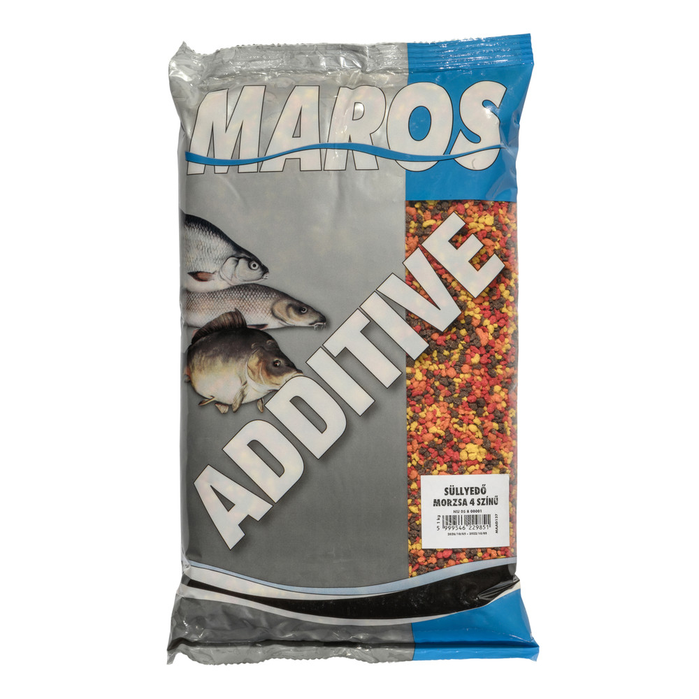 Gyakran tapasztaljuk, hogy az etetőanyagunk állaga nem tökéletes. Ilyenkor lehetnek segítségünkre a különböző Maros Mix Adalékok. Használatukkal még tartalmasabbá tehetjük keverékünket, és minden víztípushoz a legjobb állagú etetőanyagot készíthetjük el, de a rendelkezésre álló anyagokból akár egy teljesen új keveréket is összeállíthatunk. Minden Maros Mix Adalék kizárólag friss, természetes anyagok felhasználásával készül. A Maros Mix Süllyedő morzsa nem más, mint egy színezett, nehéz fajsúlyú kenyérmorzsa. Különlegessége, hogy száraz állapotában is lesüllyed a víz alá, emiatt a folyóvízi keverékek nélkülözhetetlen alkotóeleme. Kellemes sós ízét imádják a halak. A kész etetőanyaghoz 5-20% arányban lehet keverni. 1 kg-os kiszerelésben, valamint piros és sárga színben kerül forgalomba.